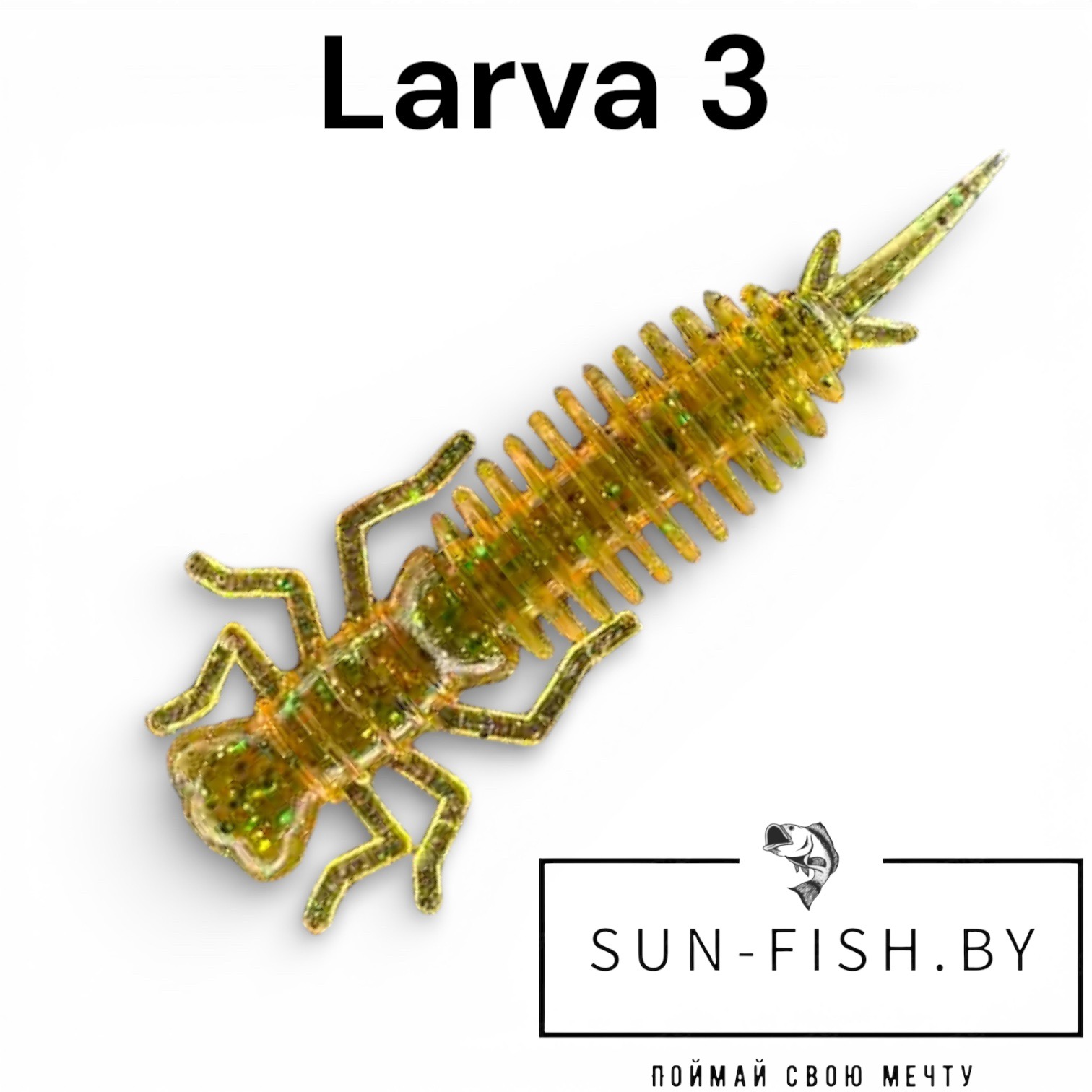 Larva — популярная съедобная силиконовая приманка, имитирующая личинку стрекозы. Отличается ребристым телом, которое удерживает воздух, создавая эффект плавучести, и реалистичными лапками с хвостиком. Эффективна в течение всего года, особенно при ловле пассивного хищника (окунь, судак) микроджигом и на отводном поводке.